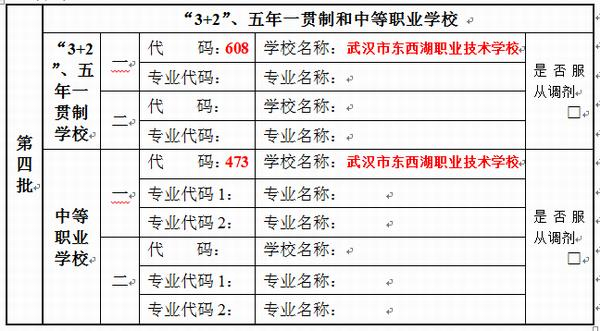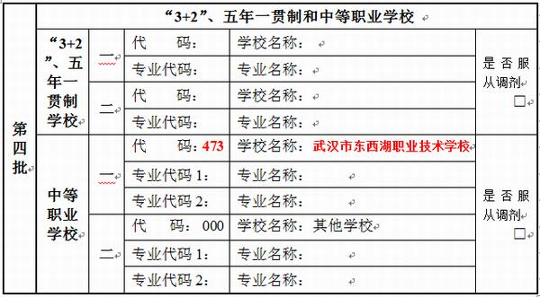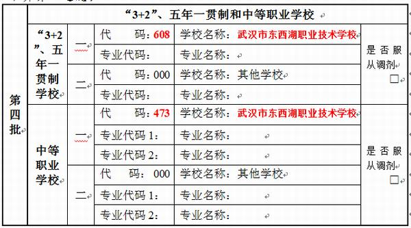 第三种情况:3+2志愿不填,中职志愿第一志愿填武汉市东西湖职业技术学校,第二志愿不填或填其他学校 5、上述填报志愿方法仅限武汉市考生,湖北省内其他地市州考生不需要填报志愿,在我校新生报名期间按报名要求带相关证件确认即可(特别提示:切记不要将准考证交给学校,中考成绩查询后截屏保存,如果成绩未达当地普高线,不要报考当地任何职校);